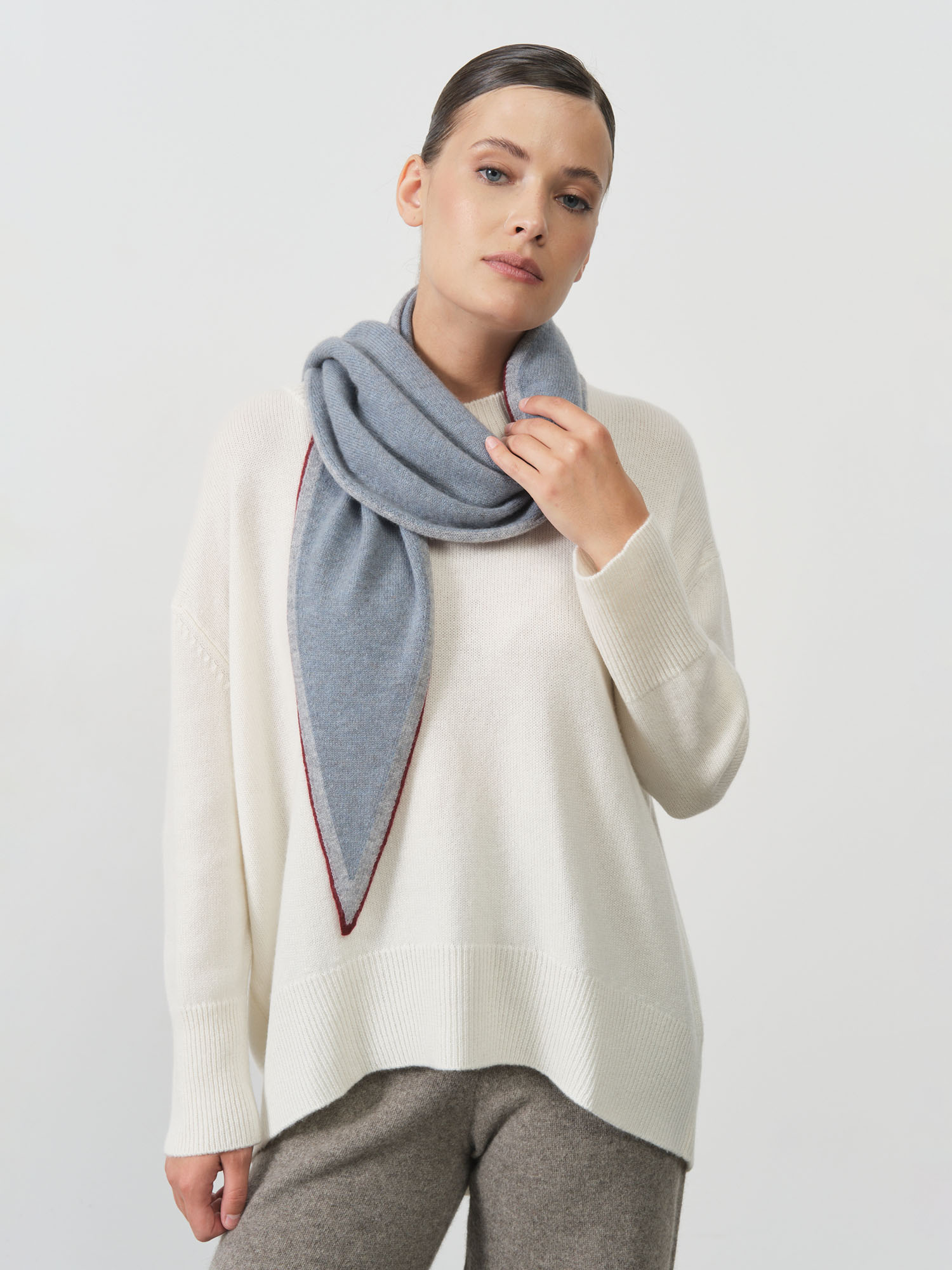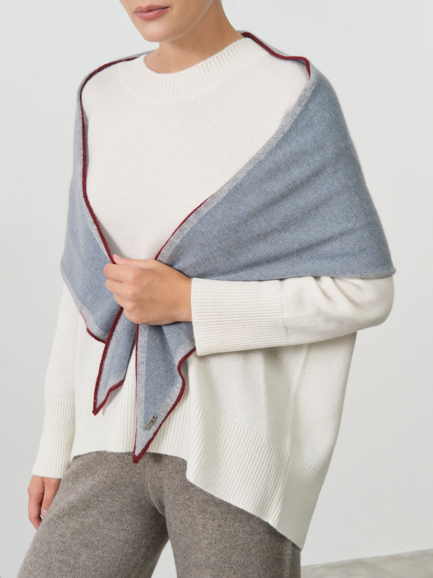 Модель выполнена в мягкой треугольной форме, что позволяет красиво драпировать изделие вокруг шеи или носить как лёгкую накидку. Контрастная окантовка по краю добавляет изделию выразительности и аккуратно подчёркивает форму аксессуара.