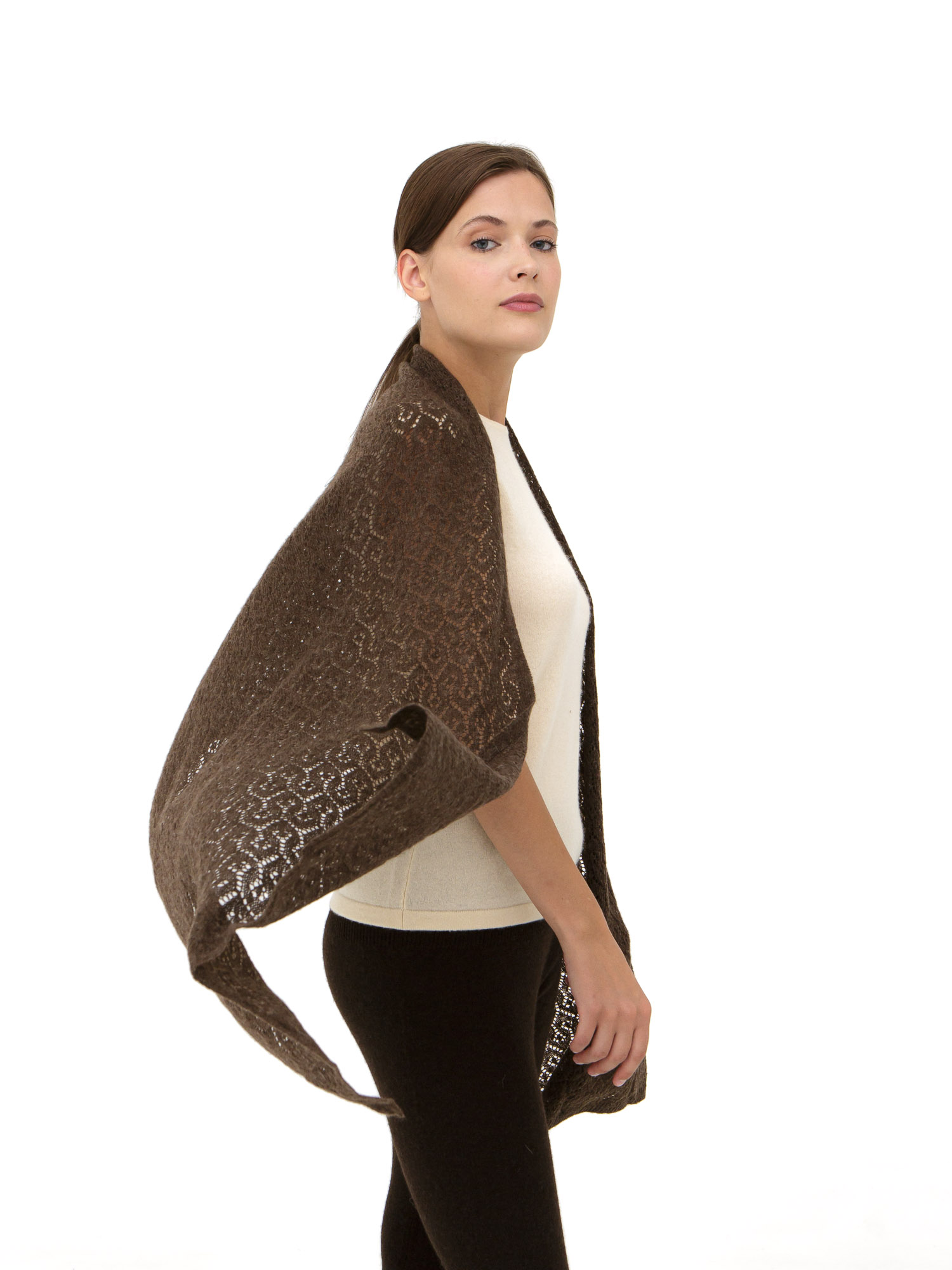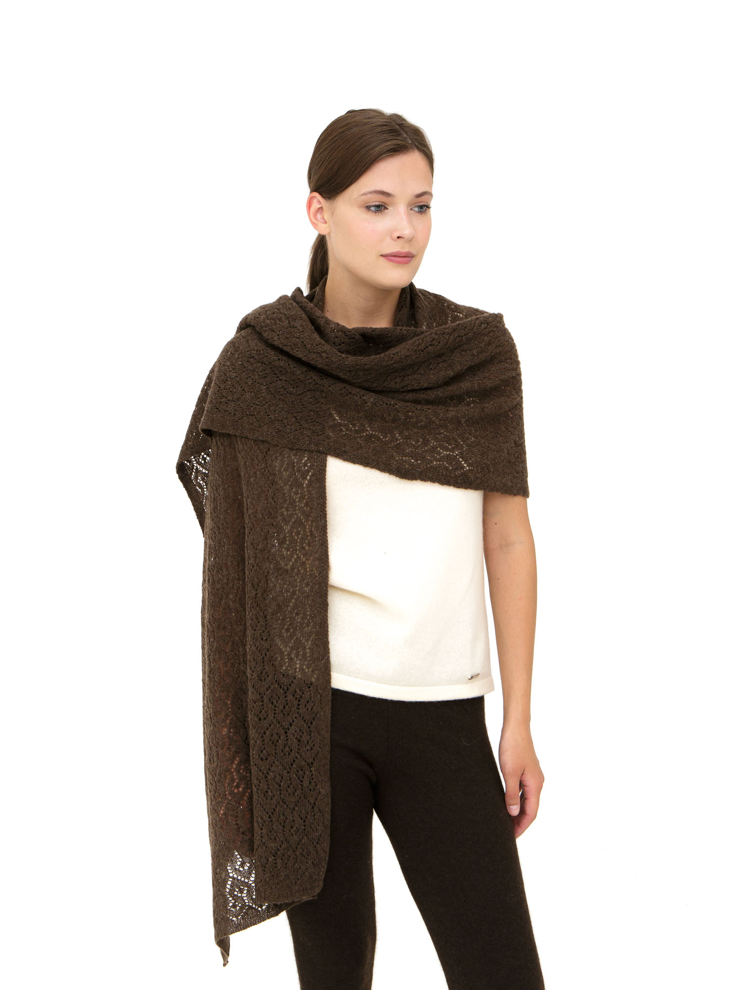 Палантин выполнен в классической прямоугольной форме с лёгкой ажурной вязкой, которая придаёт изделию изящную текстуру и визуальную лёгкость. Минималистичный дизайн без лишних элементов подчеркивает натуральность материала и позволяет легко сочетать аксессуар с различными стилями одежды.