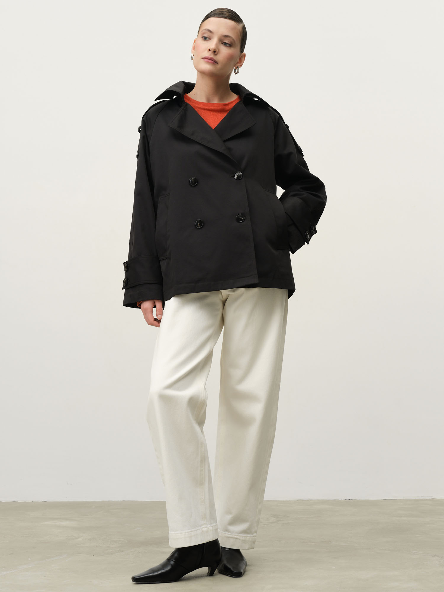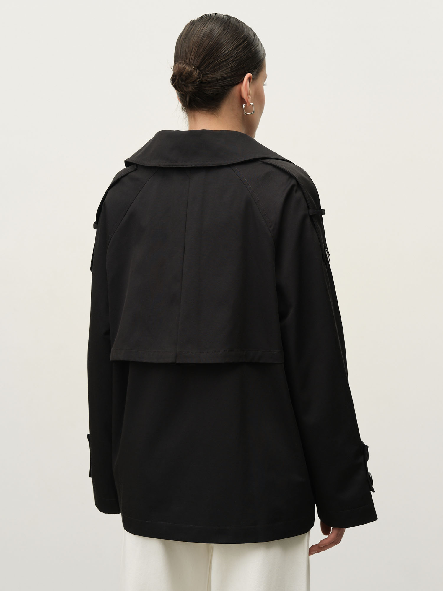 Свободный силуэт с классическими элементами тренча. Двубортная застёжка и акцент на плечах создают структурированный и современный образ.