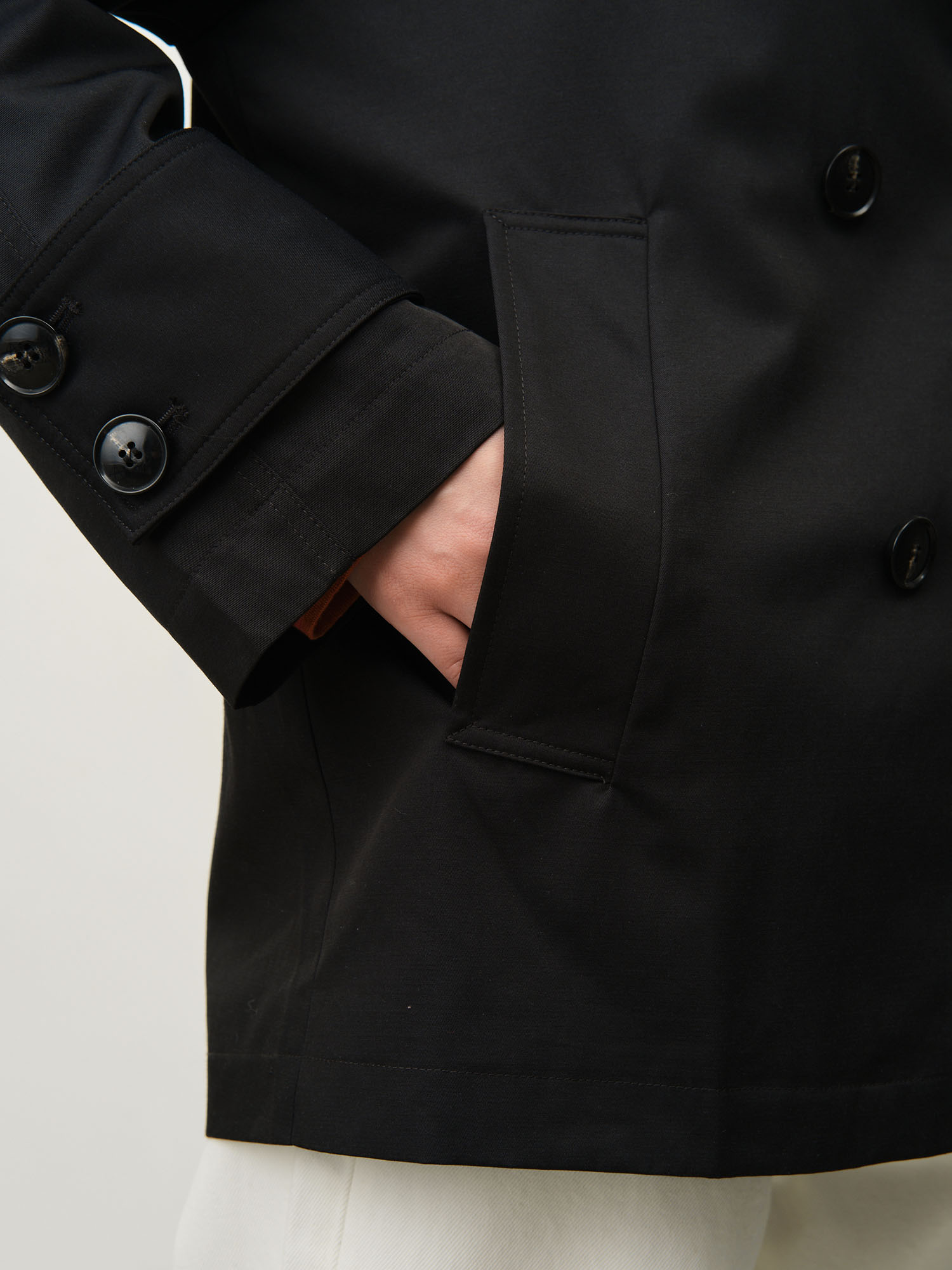 Двубортная застёжка на пуговицы, отложной воротник, погоны на плечах, декоративный клапан на спине, регулируемые манжеты, функциональные карманы.