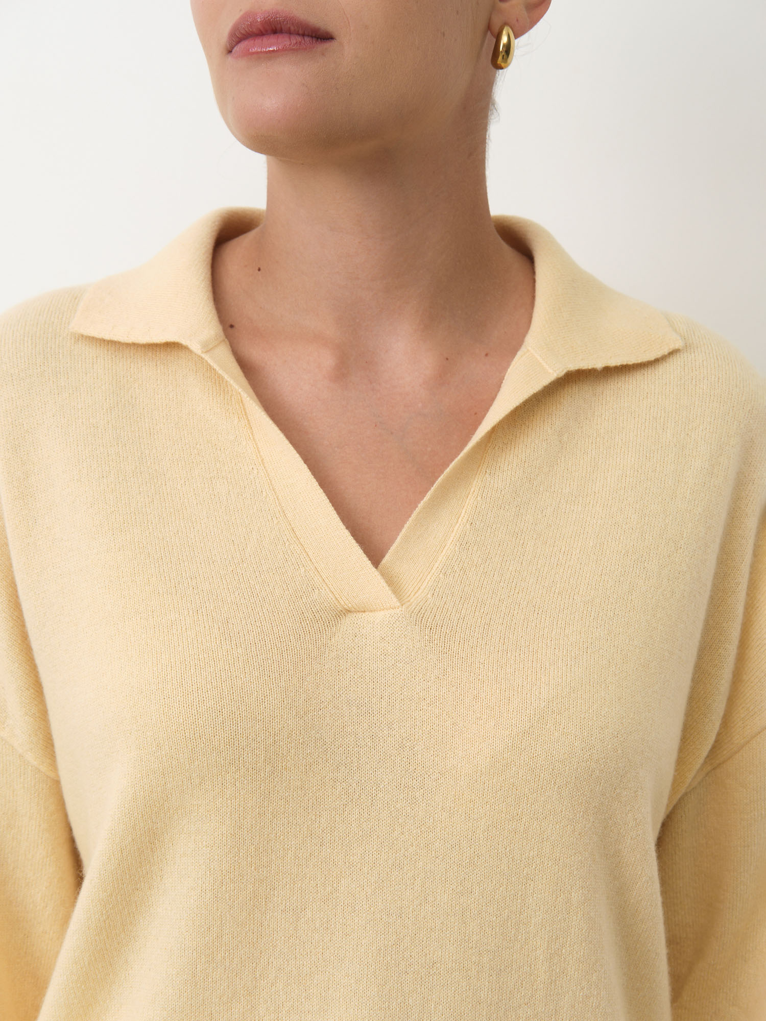 Женский джемпер из натурального кашемира в нежном оттенке шампань. Модель с мягкой посадкой и аккуратным V-образным вырезом с отложным воротником создаёт элегантный и расслабленный образ. Джемпер подходит для повседневных и более утончённых сочетаний.
