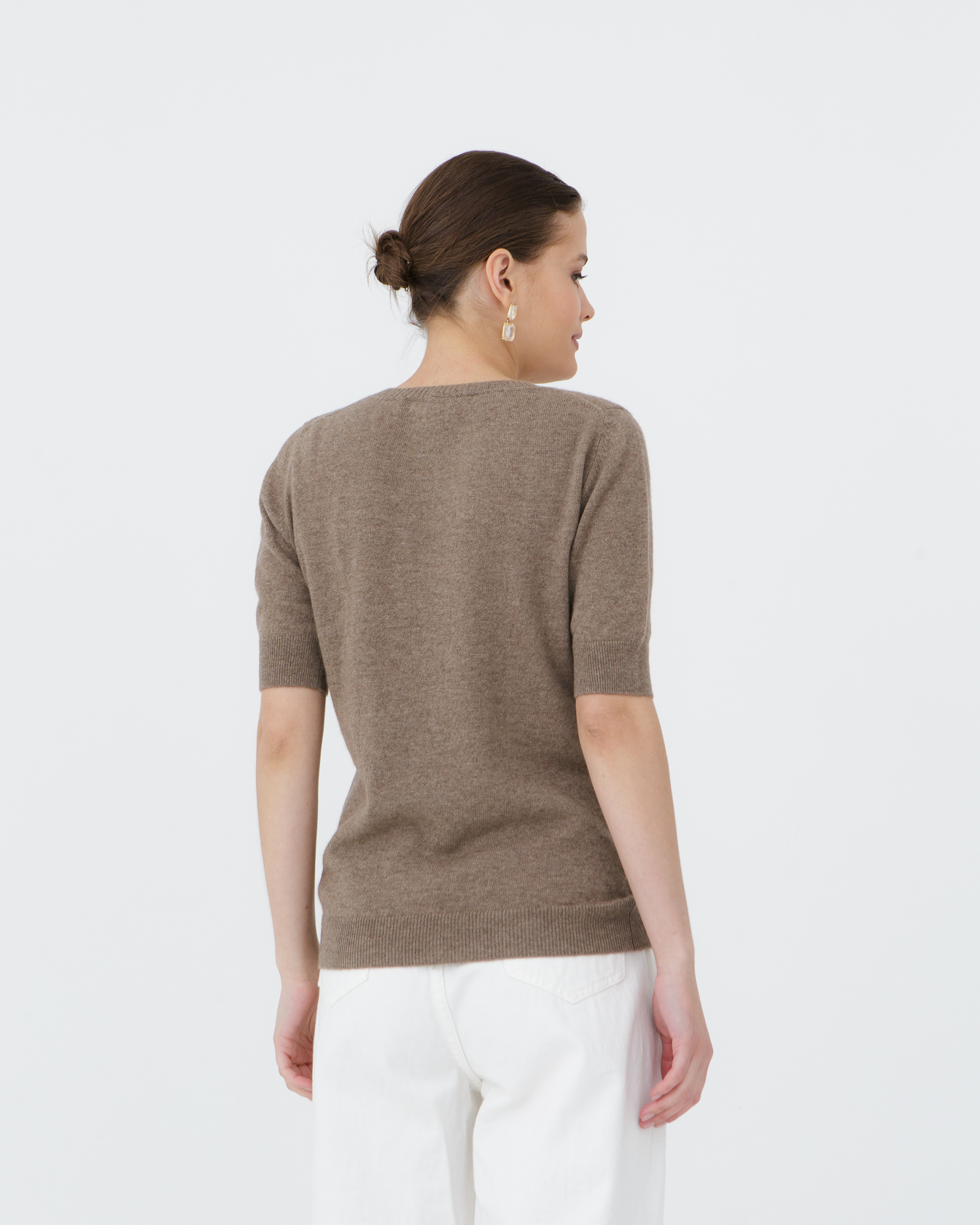 Модель выполнена в минималистичном стиле с круглой горловиной и короткими рукавами. Лаконичный крой подчёркивает универсальность изделия и позволяет легко сочетать его с различными элементами гардероба.